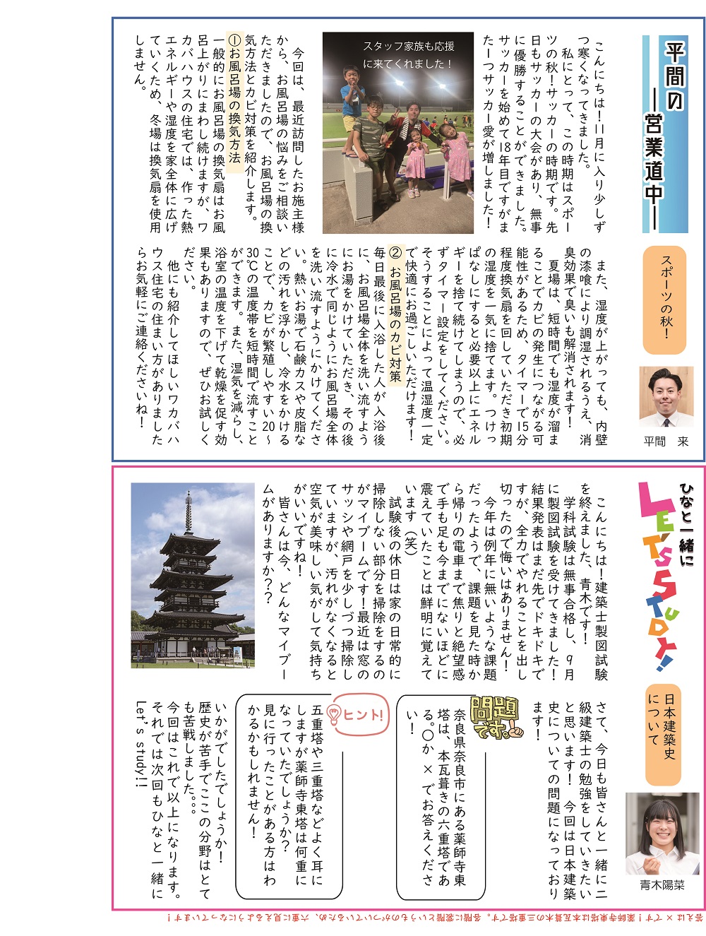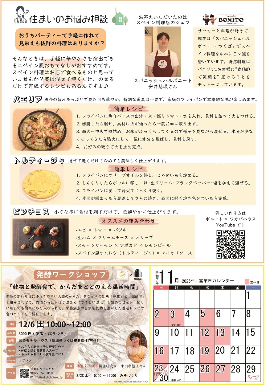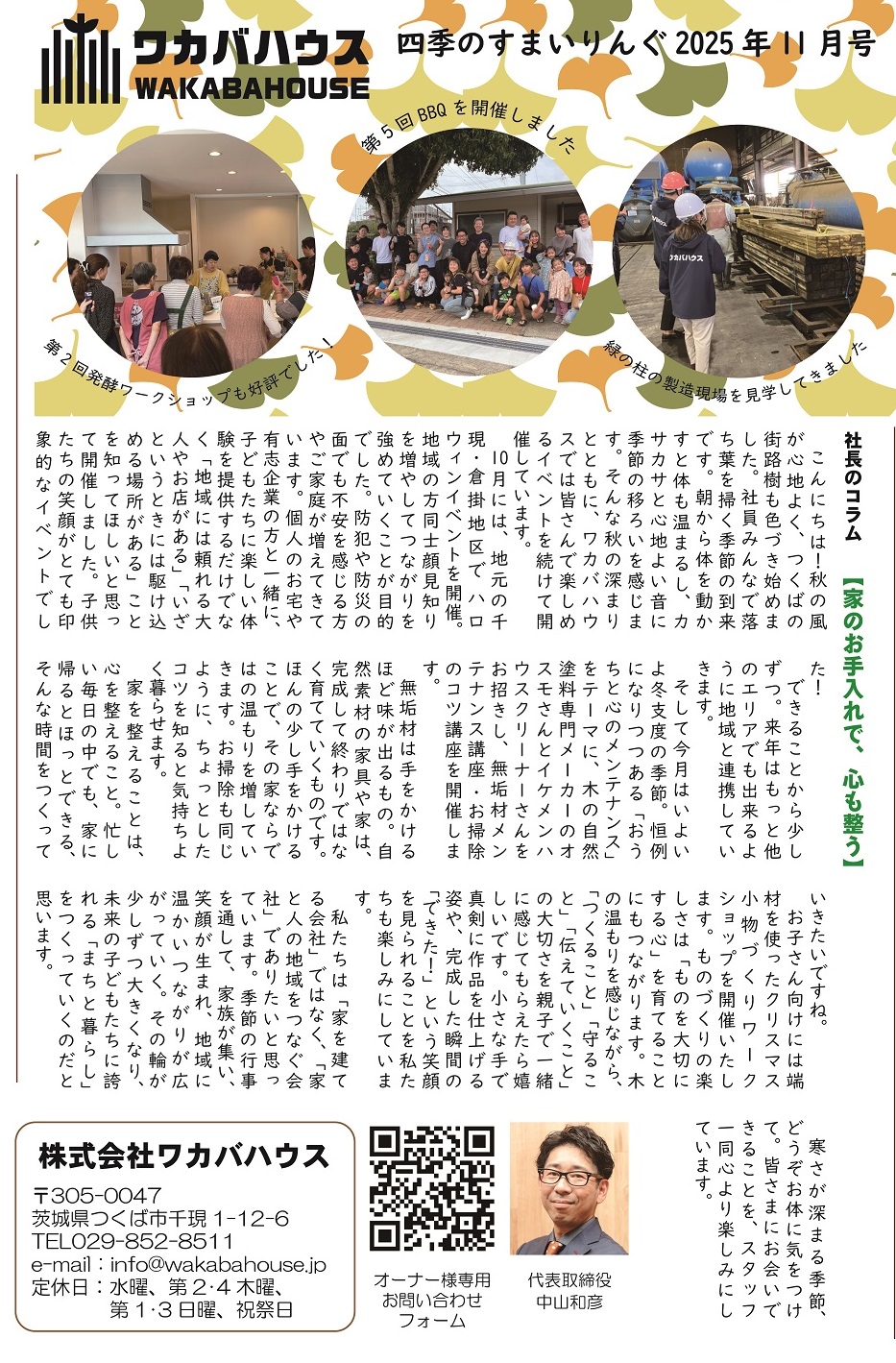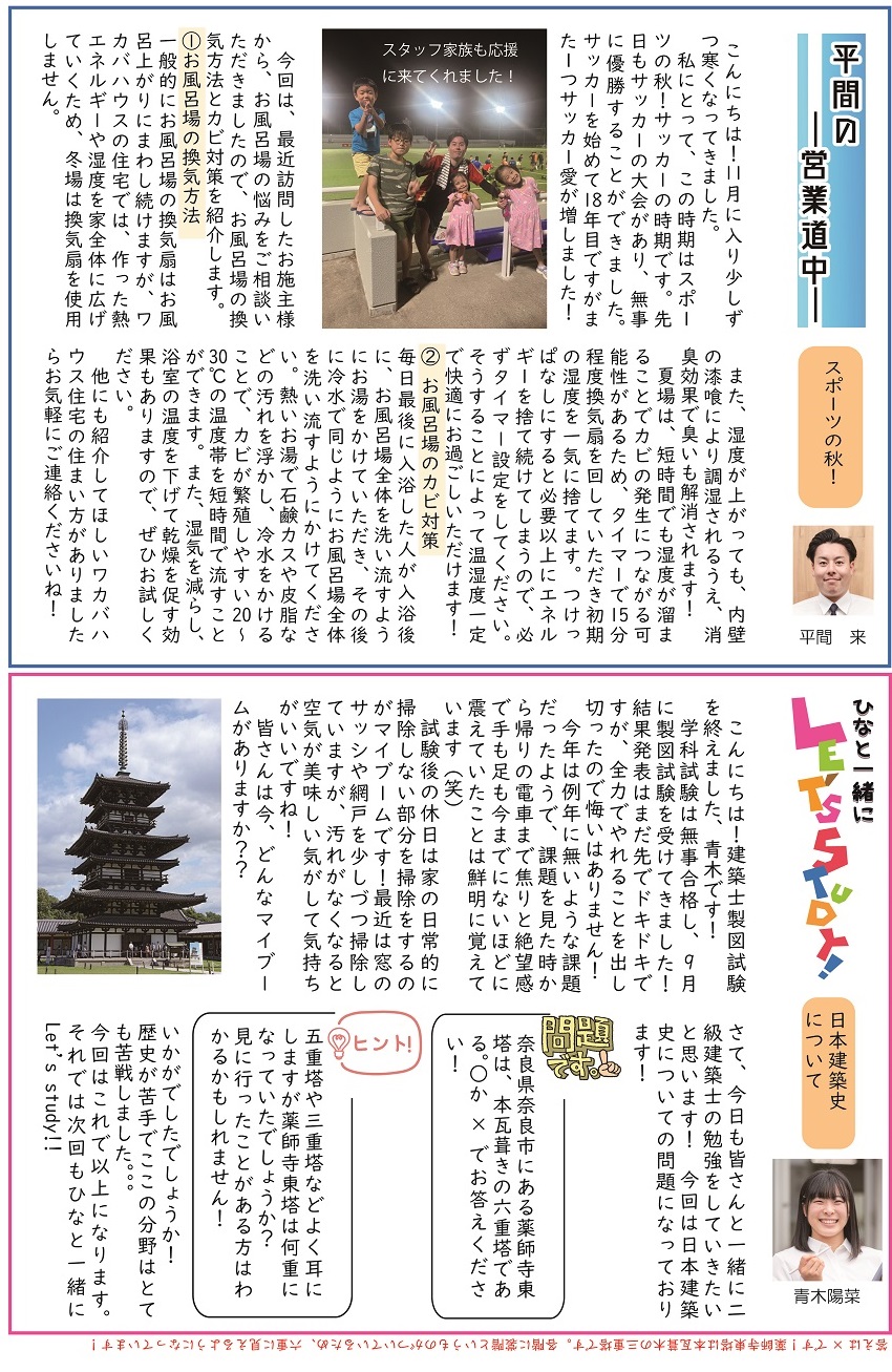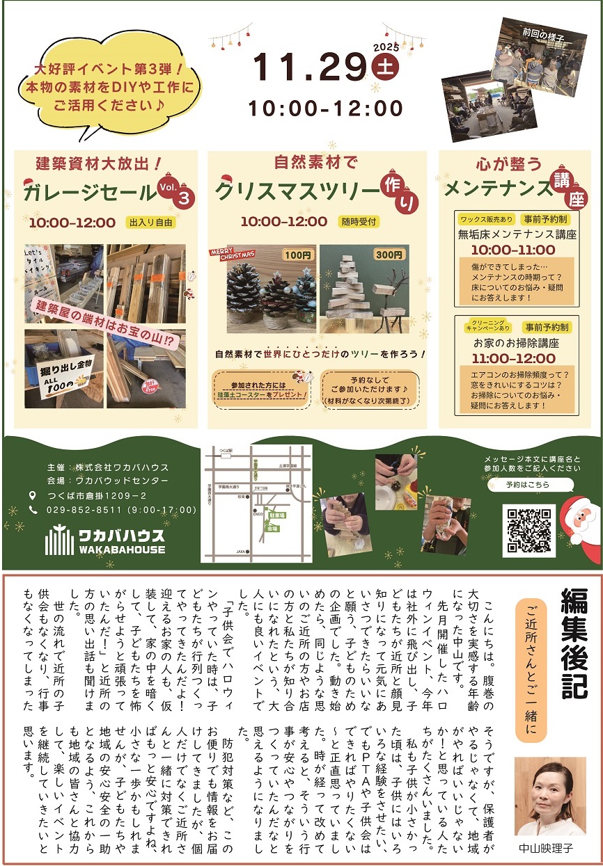 広報誌「四季のすまいりんぐ11月号」発行 2025年11月1日 毎月発行しているワカバハウスの広報誌「四季のすまいりんぐ」がHPから閲覧可能になりました。11月号の内容 ・社長のコラム「家のお手入れで、心も整う」・住まいのお悩み相談「おうちパーティーで手軽に作れて見栄えも抜群の料理とは?」・営業平間の営業道中「スポーツの秋」・工務青木のひなと一緒にLet’s study「日本建築史について」・クリスマスイベントのお知らせ・発酵ワークショップ第3回のお知らせ・営業カレンダー 一覧へ戻る